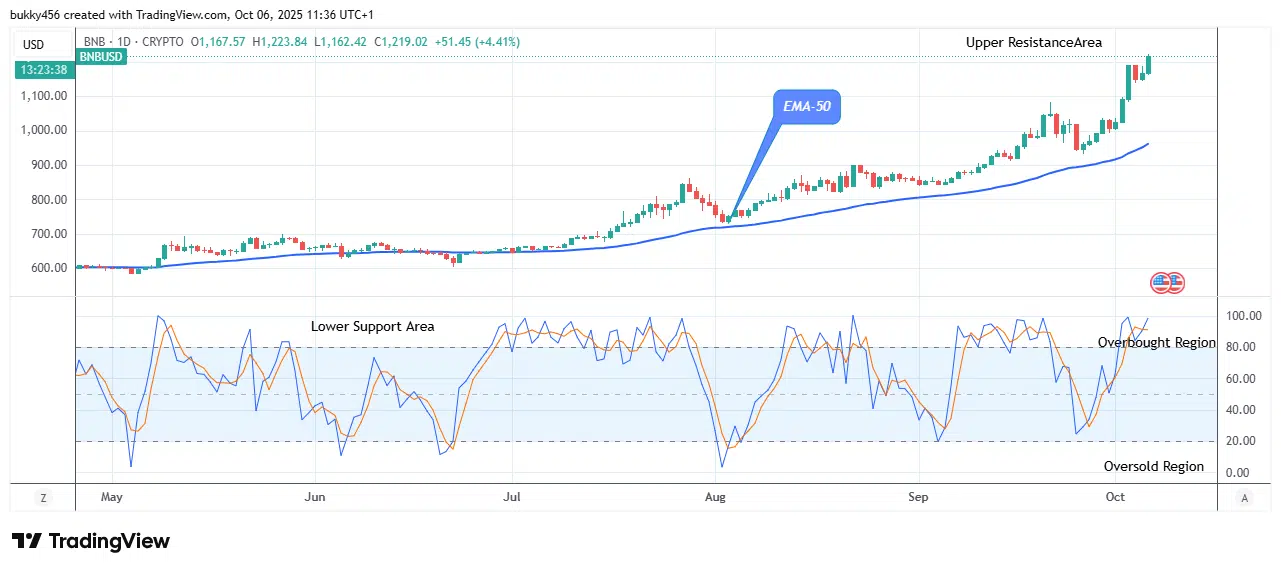 Today, the BNB price anticipates for an increase as it rises to a $1,220.72 supply value above the EMA-50 on the 4-hourly chart, encouraging buyers to invest in the asset because potential future gains are assured.