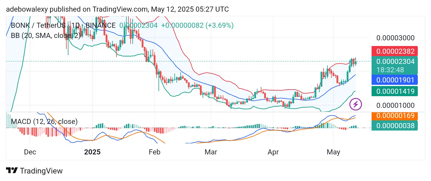 Price action in the BONK token can be seen successively rebounding upward off the middle band of the Bollinger Bands. Recently, price action hit the uppermost band, which resulted in a slight pullback.