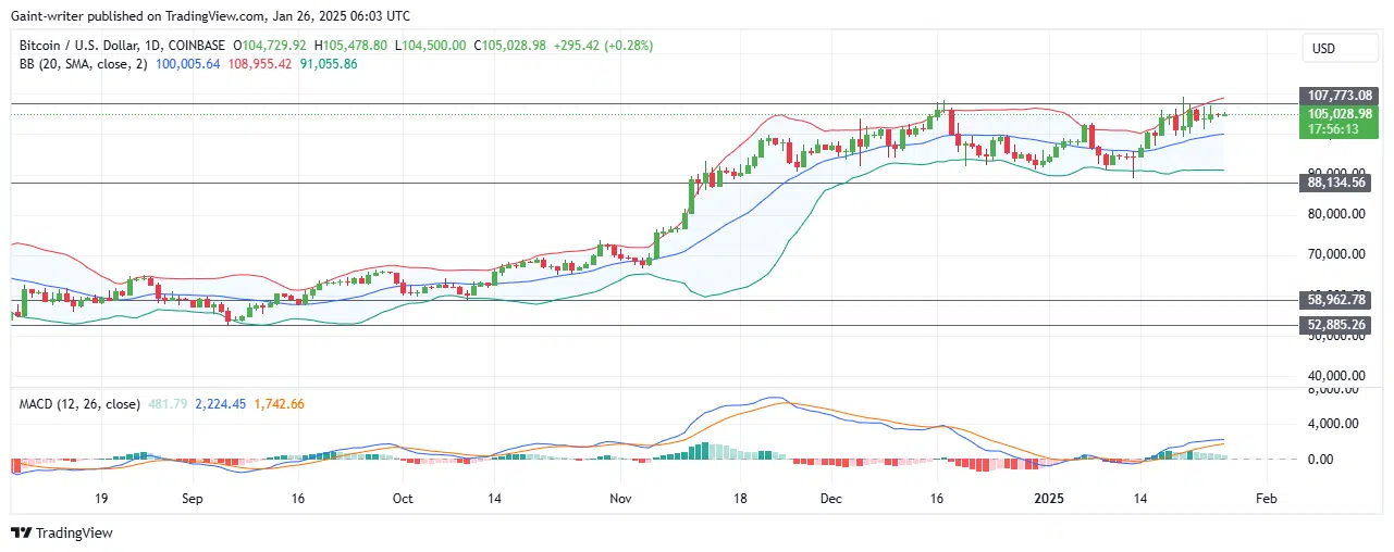 The MACD (Moving Average Convergence and Divergence) remains above the mid-signal line, confirming that buyers are directing the market’s movement. A successful breach of $107,770 would target $110,000, potentially solidifying continued bullish momentum. Such sustained buying activity could attract more investors, further strengthening the upward trend.