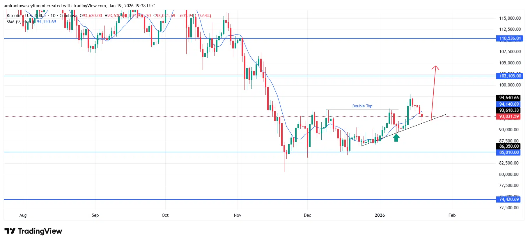 From a structural perspective, the formation of a higher low above the $85,010 support zone strengthens the validity of the developing bullish framework. The ascending trendline originating from late December remains intact, with a decisive buyer response observed within the $88,000–$89,000 region. Although supply previously surfaced near $94,600 following a double-top formation, price continues to trade above prior consolidation levels. Sustained acceptance above $93,000 helps preserve the integrity of the broader bullish structure.