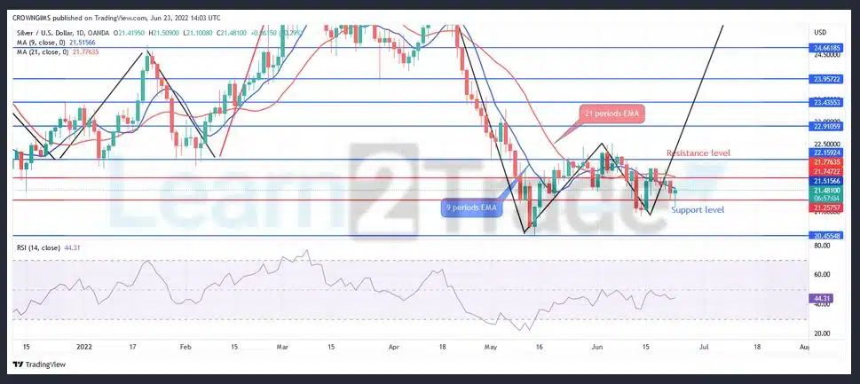 Silver price is trading slightly below the 9 periods EMA and 21 periods EMA. The Relative Strength Index period 14 is at 45 levels with the signal line displaying a bearish signal.