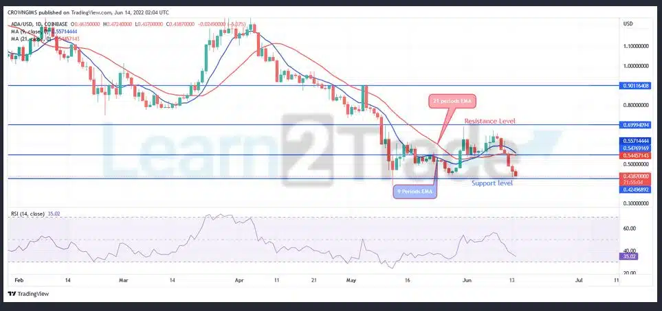 Cardano has broken down the dynamic support levels and it is trading below the 9 periods EMA and 21 periods EMA. Should the sellers exert more pressure on the market, the support level of $0.42 will be penetrated and the support levels of $0.30 and $0.22 may be reached. Inability to break down the $0.42 by the bears may lead to an increase in price to resistance levels at $0.54, $0.69 and $0.90. The technical indicator relative Strength Index period 14 is at 35 levels with the signal line pointing downside which indicates a bearish signal.
