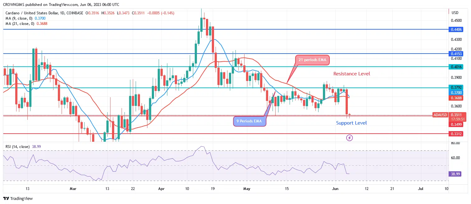 Cardano is trending downward on the 4-hour chart. In the 4-hour time frame, it appears that the price movement has created a double-top chart pattern. The price may fall further due to the bearish reversal trend. The market recently decrease from the resistance level of $0.37 to the support level of $0.35 as the bears’ momentum outpaced the bulls’. The price is falling and trying to break down the $0.35 barrier level.