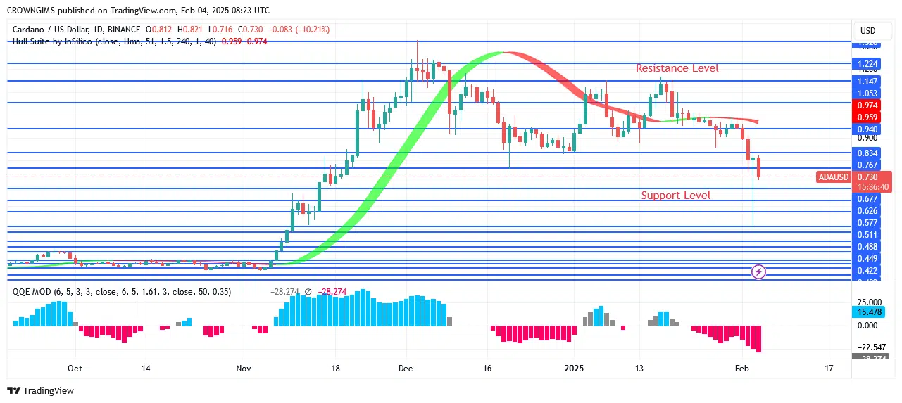 The 4-hour chart from Cardano shows a propensity for cloud cover. Two failed attempts to break above the $1.14 4-hour time frame support point have occurred in recent weeks. ADA’s value surged to roughly $1.14 as more bulls than bears submitted requests and copping instigation increased. A bearish engulfing candle formed as the currency approached the target level, suggesting that merchandisers are defending their position. At the moment, the price is dropping and approaching $0.67.