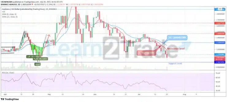 Cardano is bearish on daily chart. The bears refuses to let Cardano go. In other words sellers are in control of the Cardano market. The bearish momentum started a couple of weeks ago at the resistance level of $1.46. The bearish momentum decreases the price to $1.11 price level. The declination continues with the formation of more bearish candles which indicate the sellers’ pressure. Cardano price is testing $0.98 after penetrated the former support level of $1.11.