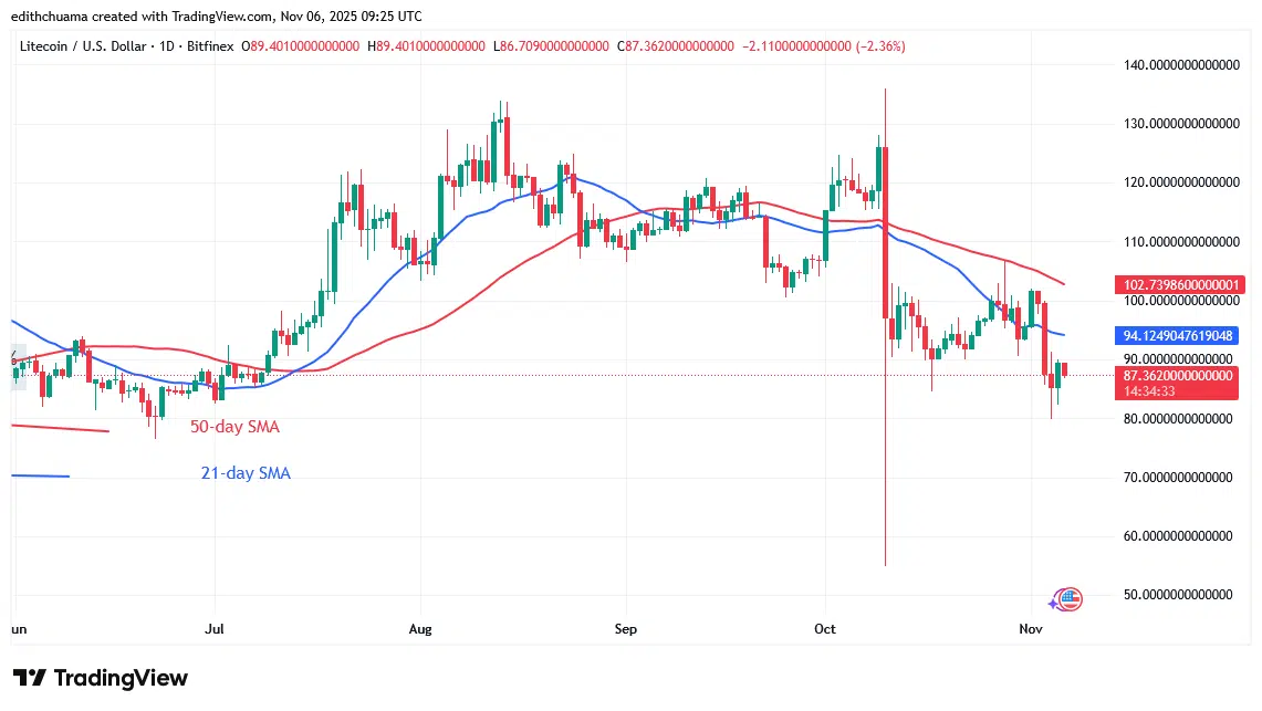 Key Highlights Litecoin revisits the previous at $71Litecoin faces rejection at $90 Litecoin (LTC) Current Statistics The current price: $87.39Market Capitalization: $6,662,506,329.98Trading Volume: $539,070,616.53Major supply zones: $100, $120, $140Major demand zones: $80, $60, $40 Litecoin (LTC) Price Analysis November 6, 2025 Litecoin’s (LTC) price falls below the $90 threshold, reaching a low of $79. The […]