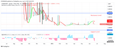 Sponge is increasing daily SPONGEUSDT Price Analysis – 25 June The bullish momentum will be strengthened if the resistance level of $0.000145 is broken, followed by the barrier levels of $0.000196 and $0.000330. If the bulls continue to push, Spongemight surge above $0.000330. SPONGEUSDT Market Key levels: Resistance levels: $0.000145, $0.000196, $0.000330 Support levels: $0.000081, […]