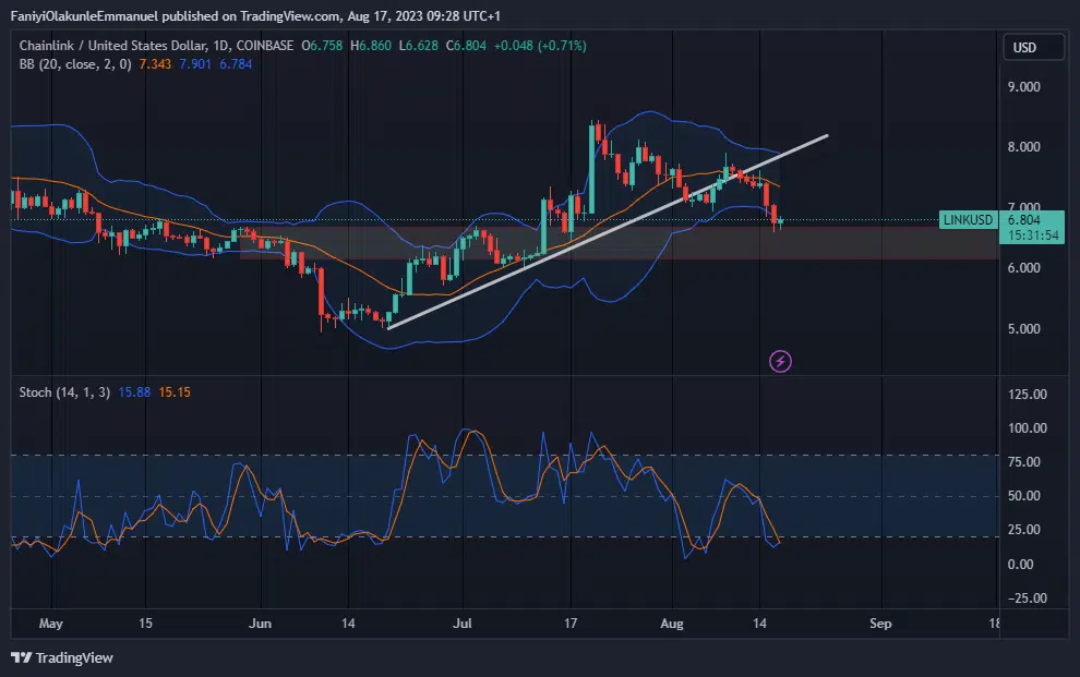 The LINKUSD price currently resides at a substantial demand level according to the daily chart analysis. Following a pronounced overbought indication from the Stochastic oscillator, the market underwent a notable retracement to the $6.80 mark.