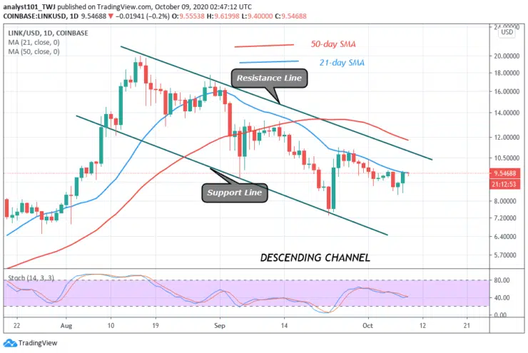 LINK is likely to make an upward move once the current resistance is broken. On September 25 uptrend; the coin was resisted at $11. The retraced red candle body tested the 61.8% Fibonacci retracement level. It indicates that LINK will rise and reach level 1.618 Fibonacci extension or the high of $14.11.