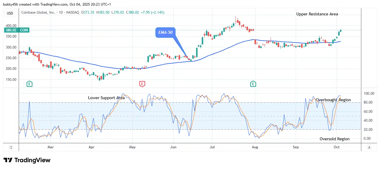 Today, the $COIN price shows a massive breakout while all support levels holds in place, recording a massive growth of 10.09% increase in value as investors and analysts continue to show keen interest in the stock market. The breakout rally at $383.50 is approaching the overhead resistance. Over the last 24 hours, the share’s increasing network activity and expanding user confidence have stayed steady. Looking promising at the mentioned supply, if stock buyers strengthen their pressure and the price holds above the previous high of $405.88, the stock price may continue to rise to the $415.96 upper barrier level and beyond, leading to a strong buying opportunity for traders.