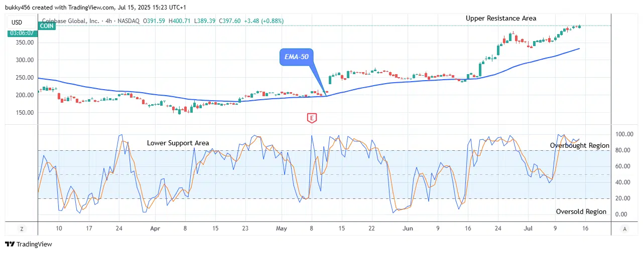 The 4-hourly chart for today demonstrates a more extensive price rebound, as the bulls pulled back to a $400.71 resistance value above the EMA-50 at the time of writing this article, as they aim to continue trending up and drag the $COIN price to a significant level on the upside.