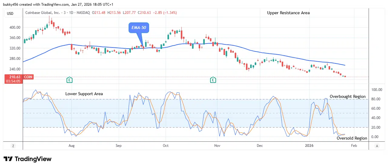 According to the chart below, the $COIN market portrays a bearish market trend in its medium-term outlook. The share is trading below the EMA.
