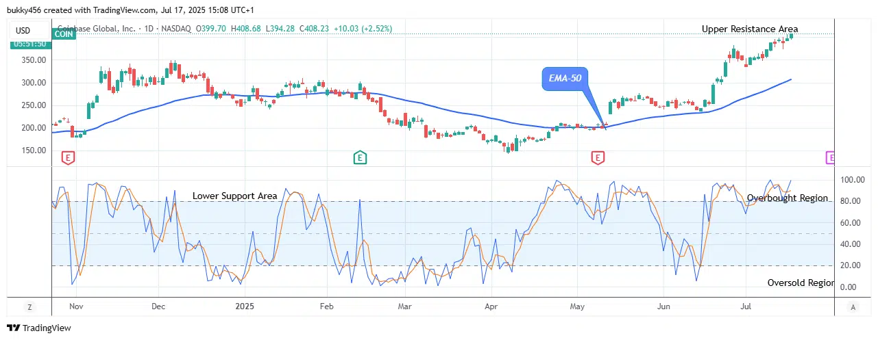 The NASDAQ:COIN market indicates an upward trend as it hits an all-time high of $408.68 experiencing a notable price surge in its long-term perspective.