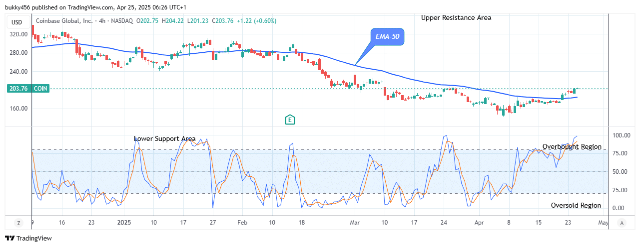 The $COIN price jumped to a $204.21 resistance level above the EMA-50 as the daily chart resumes today.