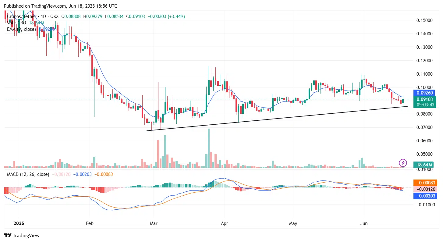 Price action on the CRO/USDT daily chart shows a rebound in the ongoing session. This rebound appears moderate and remains below the 9-day moving average.