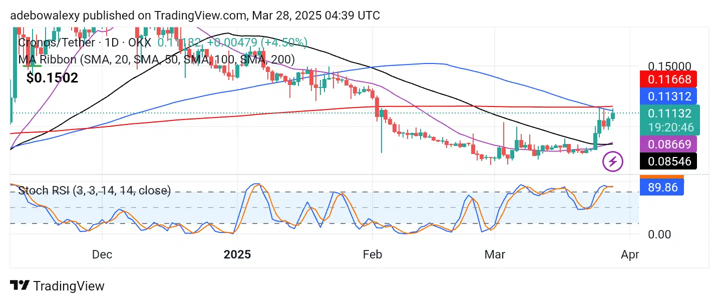 Despite this, price action remains above all Stochastic RSI lines, which are still trending upward without significant deviation. Given these market dynamics, traders may target the short-term resistance level at $0.1200.
