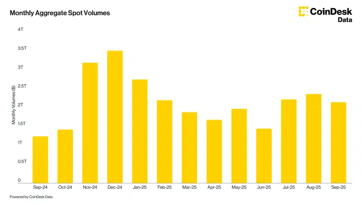 Trading activity across crypto exchanges dropped in September 2025, ending a three-month growth streak. Combined spot and derivatives volumes fell 17.5% to $8.12 trillion, marking the fourth straight year that September has seen declining volumes.