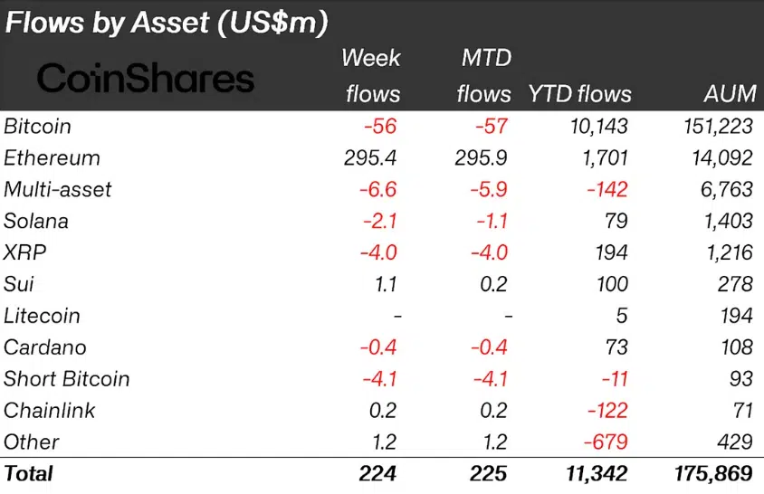 Bitcoin faced headwinds for the second straight week, experiencing $56.5 million in outflows as policy uncertainty kept institutional investors cautious. Even short-bitcoin products saw redemptions, indicating broad hesitation around bitcoin exposure until regulatory clarity emerges.