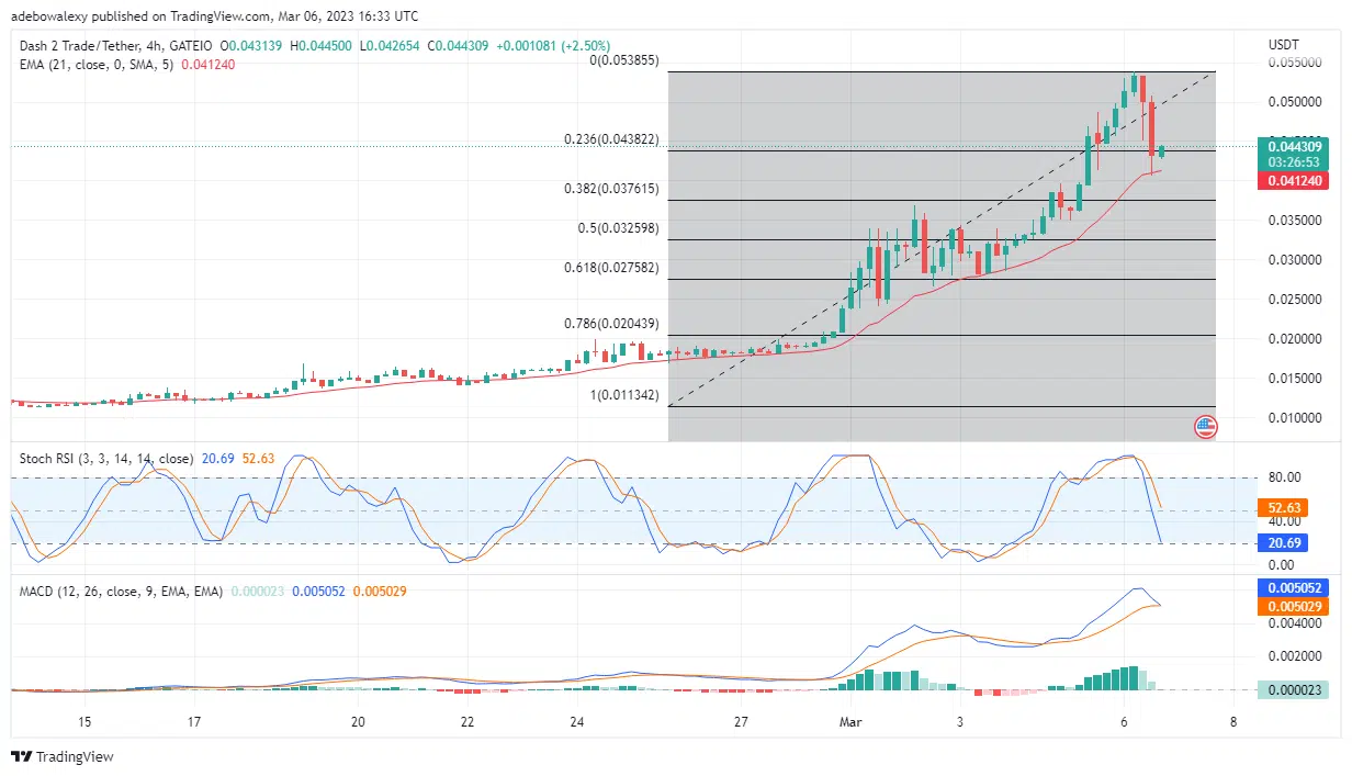 After the Dash 2 Trade price retraced the $0.04416 support, it appears as if buyers have regrouped at this level. Now buyers have started pushing prices upward once more, and above the 21-day EMA line. The lines of the MACD indicator are still above the equilibrium point of 0.00. Nevertheless, these lines are now touching at the tip in an attempt at a crossover. Meanwhile, the RSI curves continue to move toward the oversold level. It is important to note that the MACD curves are still above the equilibrium level and that the last price candle here is a bullish one of moderate size. Consequently, as buyers continue to mount buying pressure, prices in this market will continue to rise from this point on.