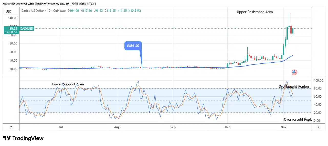 At the time of writing, the DASHUSD bulls exhibit an essential growth to a $117.66 high point above the EMA-50 as the daily session opens today, confirming the bulls’ dominance in the market.