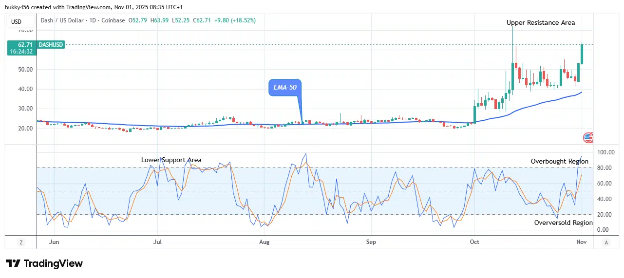 At the time of writing, the DASHUSD price signal is pointing upwards, indicating a bullish move. In this case, the crypto price could surge to the $72.00 upper region in its medium-term outlook.