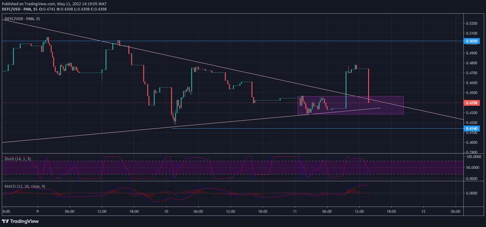 The price action on the 1hr time frame, which gyrated from the 7th of May, was geared towards the demand zone at $0.4140. A breakout has been spotted from the symmetrical triangle. The bulls are likely to defend further bearish moves with the aid of the supporting trend line.