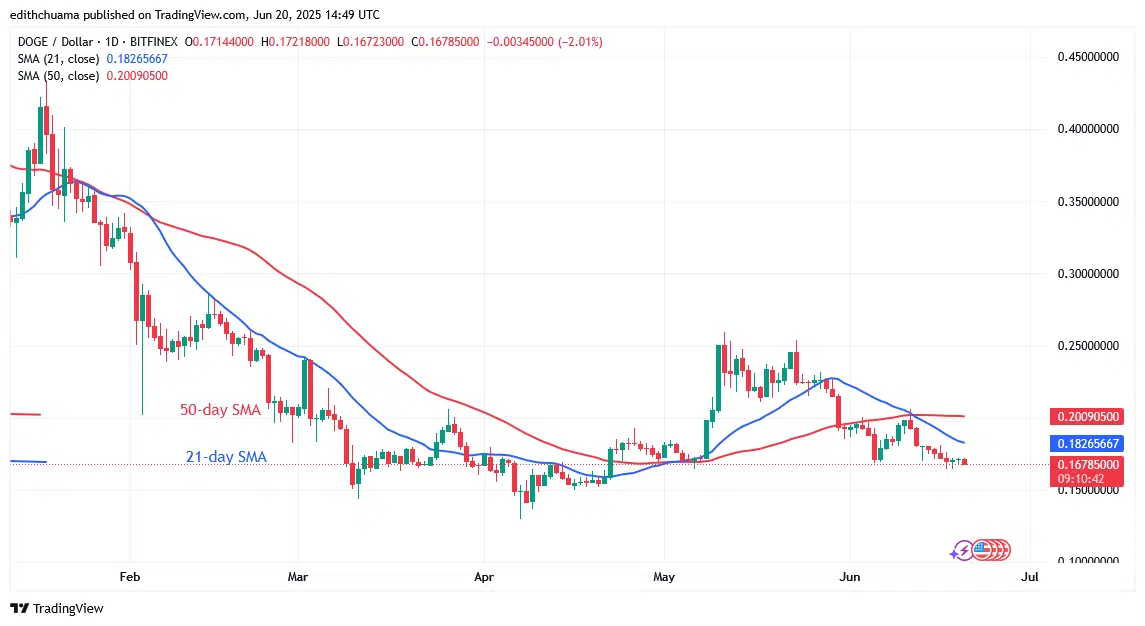 Dogecoin’s (DOGE) price falls as traders struggle above $0.16. The price above the $0.16 support has remained elusive for both bulls and bears since June 5. The altcoin has been trading below the moving average lines and above the $0.168 support for the last two weeks.