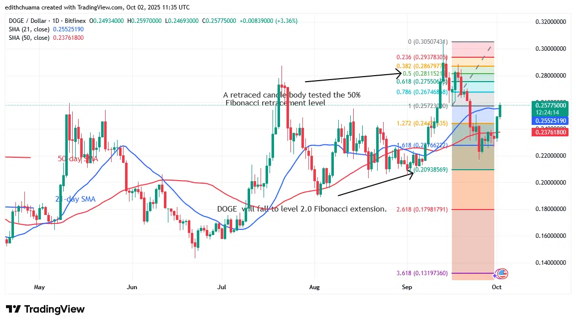 Dogecoin (DOGE) price resumes positive momentum but halts below the $0.26 barrier. However, the bulls broke above the 50-day and 21-day SMA barriers, but the price has yet to retest and close above the 21-day SMA support. DOGE will rise to highs of $0.28 and $0.30 if the crypto price closes above the 21-day SMA support level.