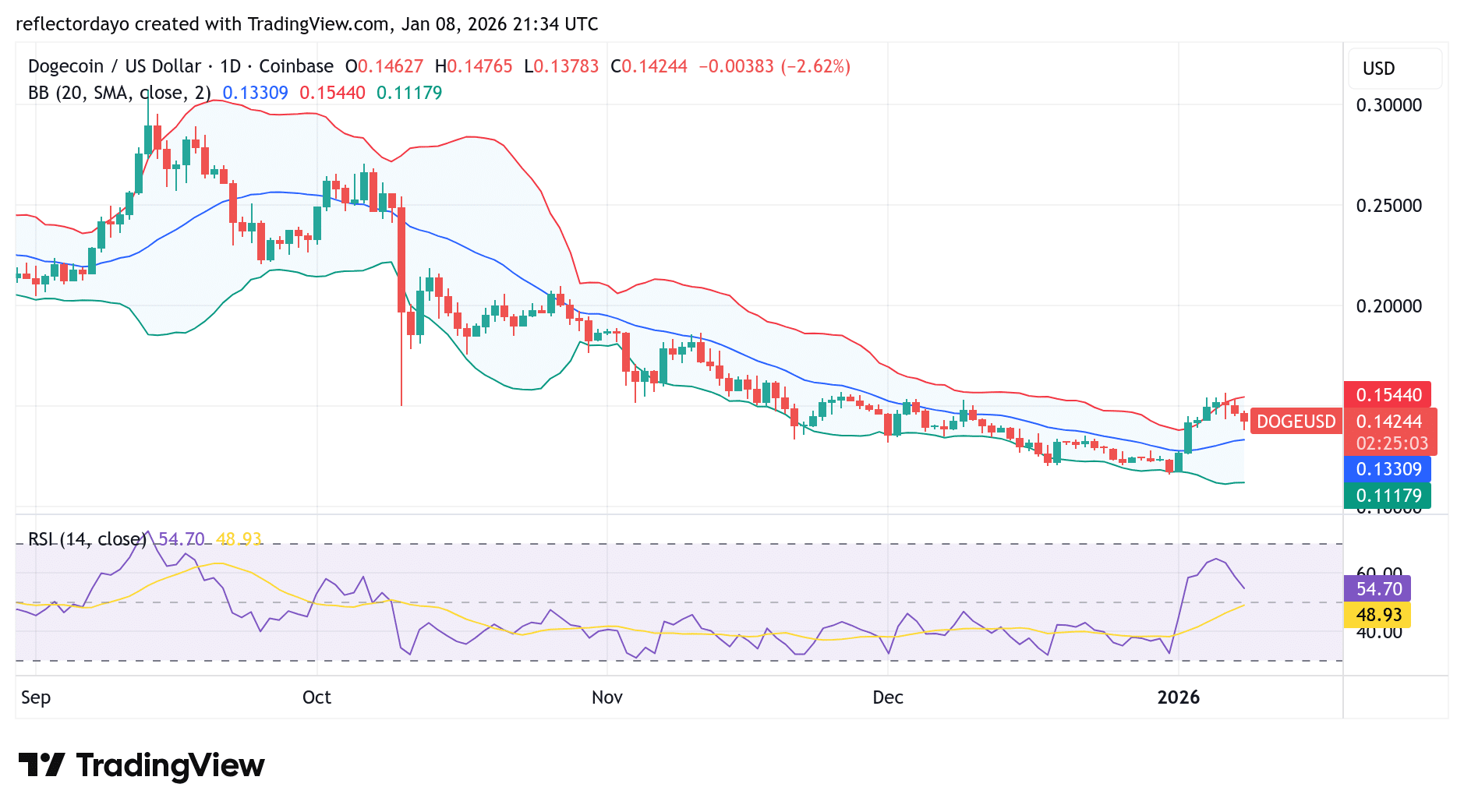 In recent daily trading sessions, the Dogecoin market has shown signs of upward traction as bearish sentiment begins to weaken. However, bullish momentum remains relatively modest, limiting the pace of the advance. After Dogecoin recovered above the $0.12 level following a brief breakdown, renewed buying interest emerged and pushed prices higher. This bullish bias, however, lost steam near the $0.155 level, where the market peaked and encountered resistance.