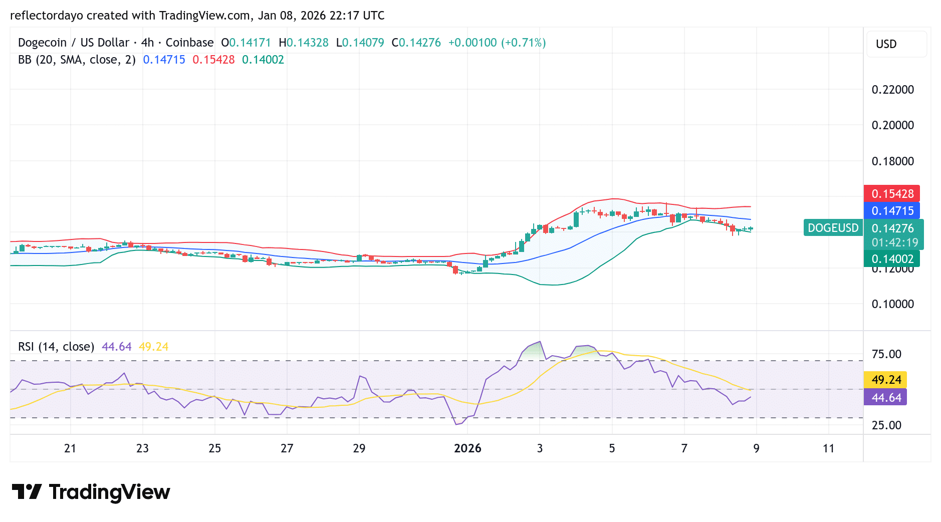 Shifting focus to the 4-hour chart, the Dogecoin market maintains a bullish structure, supported by a rising support trend that has advanced from the $0.12 level to around $0.142. However, price action currently reflects a standoff between demand and supply, leaving traders largely indecisive in the short term. A decisive breakout from this consolidation zone could reinforce bullish sentiment and potentially drive the crypto signal beyond the $0.155 resistance level, with scope for an extension toward the $0.16 mark.