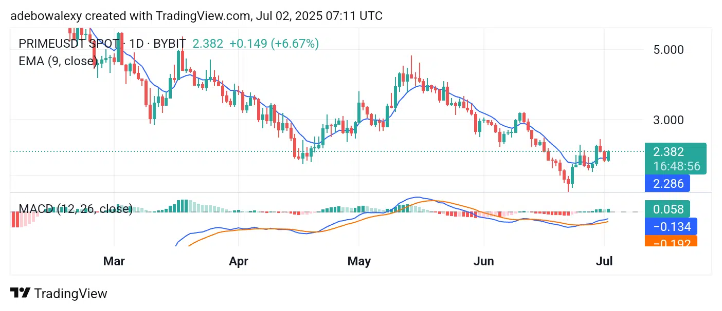 Although price action on the PRIME daily chart had retraced to lower levels for two consecutive sessions, the ongoing session has posted a notable recovery. As a result, the token is now trading above the 9-day Exponential Moving Average (EMA) curve.