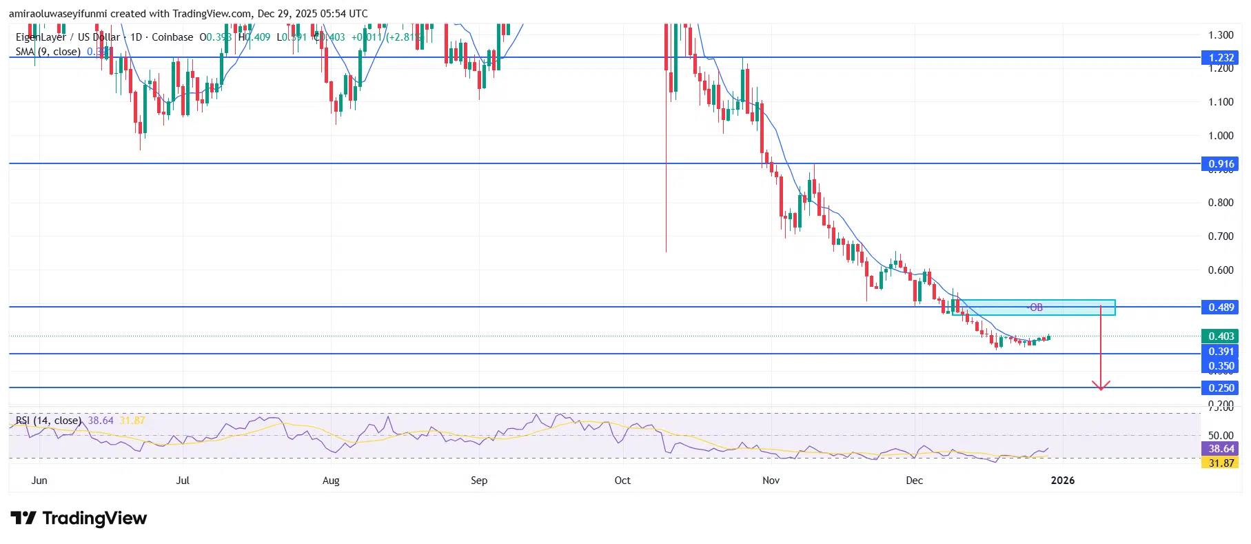 EIGENUSD structure turns bullish after prolonged downtrend phase formation. EIGENUSD is showing early bullish reaccumulation after an extended corrective phase. Momentum indicators are stabilizing, with RSI recovering from oversold conditions and trending upward toward the neutral zone. Price is beginning to reclaim short term moving average levels, suggesting improving sentiment and reduced downside pressure. Overall structure now reflects a transition from distribution to accumulation.