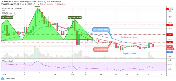 EOSUSD is bearish in the long-term outlook. The Crypto found support at $2.3 on September 24. The sellers could not break through the support level at $2.3, the price pulled back to retest the resistance level of $2.7 but the dynamic resistance levels prevented the move. The confluence at the region prevents the bulls to break up the $2.7 level. The scenario leads to a ranging movement within the $2.7 and $2.3 levels.