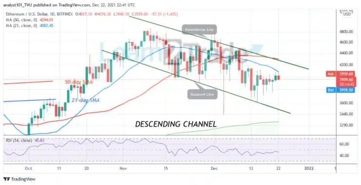 Since December 17, the bearish pattern of Ethereum was interrupted as it was unable to sustain above $4,076. Initially, Ether’s price was making a series of lower highs and lower lows. On December 17, the ETH price was in a sideways move. Presently, Ether’s price is facing rejection at the 21-day SMA. The market will decline to the downside if it faces rejection at the recent high. On the other hand, if the bulls break above the moving averages, the altcoin will resume an uptrend. Ether will revisit the previous highs of $4,800.