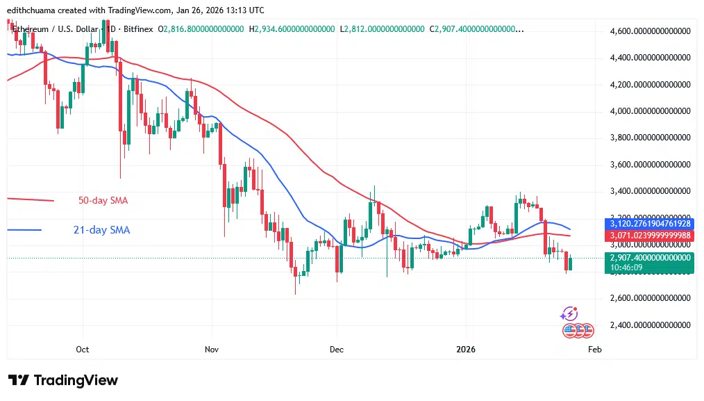 Ethereum’s price slips below the moving average lines but stays above $2,800. Since November 21, the largest altcoin has consistently traded above the $2,600 support but below the moving average lines or the $3,400 resistance level. Today, the altcoin is rebounding after hitting a low of $2,783. Ether is trading above the $2,600 support level but below the moving averages.