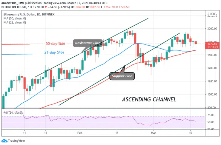 Ether has been in a downward correction for the past three days, The coin is fluctuating between $1,740 and $1,820. Today the price is falling after retesting the $1,800 resistance level. The selling pressure will increase if the bears break the current support at $1,740. That is, the biggest altcoin will further decline to $1,640. Meanwhile, Ether is trading at $1,775.80 at the time of writing.