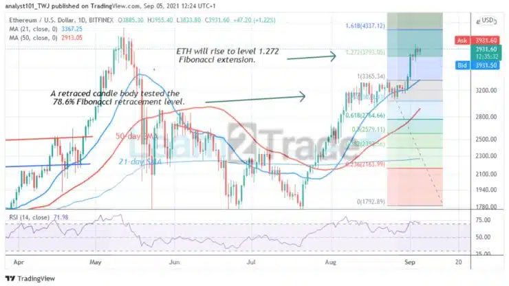 Ethereum (ETH) has made impressive bullish runs as it reached $4,000 high and pulled back. The uptrend is stalled at the $3,960 high. The biggest altcoin has been struggling to break above the recent high for the past five days. Ether upward move is doubtful as the altcoin reaches the overbought region. Meanwhile, on August 23 uptrend; a retraced candle body tested the 78.6% Fibonacci retracement level. It indicates that the market will rise to level 1.272 Fibonacci extensions or level $3,793. From the price action, the crypto has broken above the Fibonacci level and it is struggling below the $3,960 high.