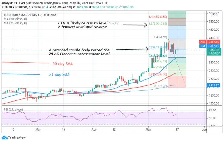 Ethereum is in a downward correction after its rejection from the $4,400 resistance zone. The biggest altcoin fell to the low of $3,600 and resumed a sideways move. Presently, the altcoin is fluctuating between $3,600 and $4,100. Meanwhile, a retraced candle body tested the 78.6% Fibonacci retracement level. The retracement indicates that ETH is likely to rise to level 1.272 Fibonacci level and reverse. That is the high of $5,010.83.