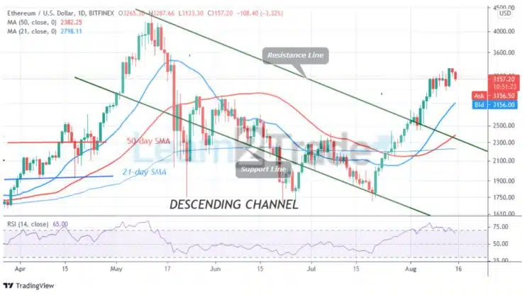 Ethereum has been falling after the rejection from the previous highs. The crypto is consolidating above the $3,100 support. It is signaling a possible reversal of the bearish trend. Meanwhile, on August 14 uptrend; a retraced candle body tested the 50% Fibonacci retracement level. The retracement indicates that Ethereum will fall to level 2.0 Fibonacci extensions or level 3079.66.