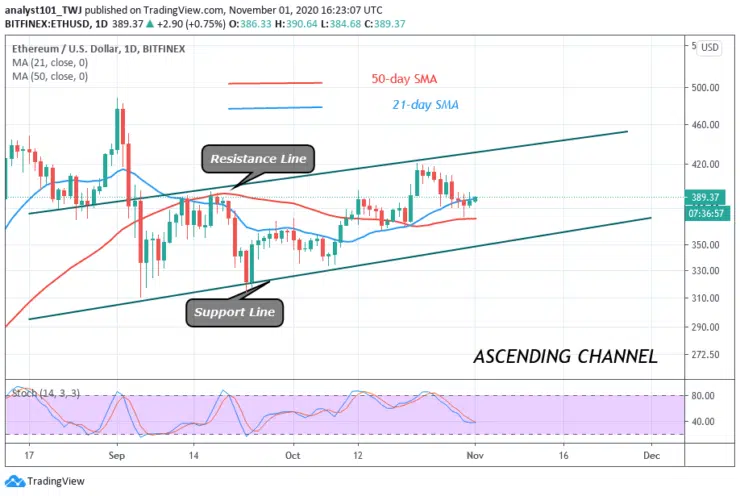 Ethereum has continued its upward move after recovering above $380 support. On October 30, the biggest altcoin fell to the low at $375 as the bulls buy the dips. The coin has moved up and retested the high of $394. Presently, the coin is fluctuating between $375 and $394.