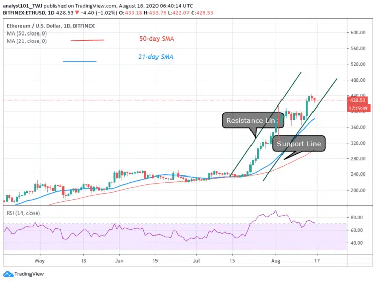 Nevertheless, the market will move up if the current support holds. The price will rise and retest the $440 resistance. On the other hand, if the current selling pressure persists and breaks below the $420 support, ETH will fall to $390 low. This will portend negatively for the coin. Meanwhile, price is currently above the $420 support.