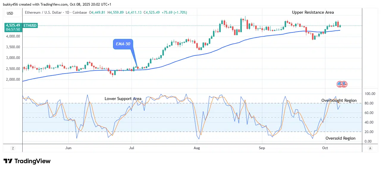 Today, the Ethereum price rebounded from the lows of yesterday at $4,432.47 to a high of $4,559.89 above the moving average as of the writing time, signaling a potential buy signal or opportunity for coin traders.