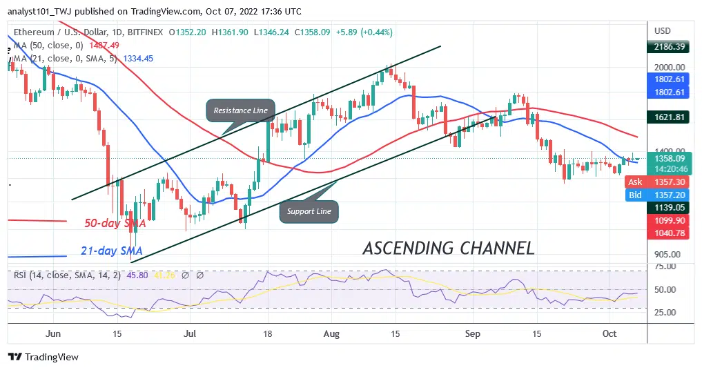 Ethereum(ETH) is in an upward correction as it holds above $1,300 . The bullish momentum is stuck at the $1,400 high. Given that Ether will continue its range-bound move between $1,220 and $1,400 price levels. The price movement has been stagnant because of the presence of small-body indecisive candlesticks. The market will trend upward if buyers breach the resistance at $1,400. Ether will further rise to the high of $1,800. However, sellers will resume a downtrend if the current support at $1.220 is breached. This will cause the biggest altcoin to decline to the previous low at the $1,000 price level.