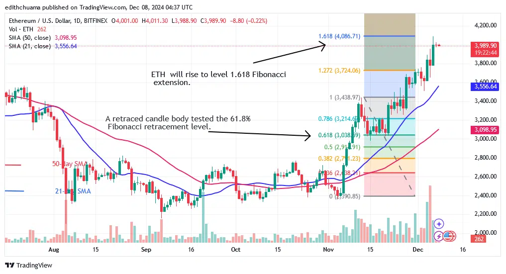 Ethereum (ETH) hovers below the psychological price level of $4,000 as it attempts to resume its ascent. The altcoin has been fluctuating below the recent high for the past 48 hours, and the bears are expected to pose stiff resistance at the $4,094 high. On the upside, if the bulls overcome the resistance at the recent high, the largest altcoin will rally to the high of $4,500. The uptrend will restart if Ether retraces and rebounds above the 21-day SMA.