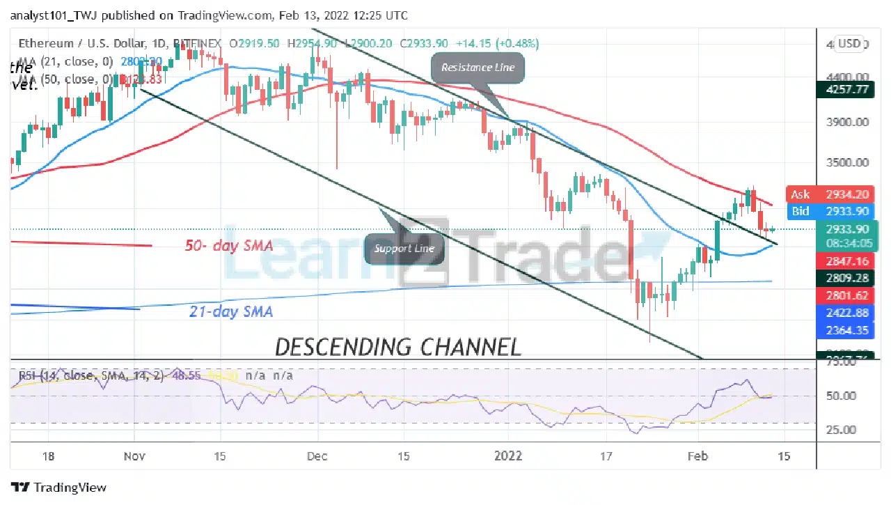 Ethereum’s (ETH) price is in an uptrend as it may revisit the $2,800 Support. The uptrend was resisted at the high of $3,288. The altcoin declined below the 50-day line moving average. Ether price is now trading above the 21-day line moving averages but below the 50-day line moving average. This indicates that the largest altcoin is likely to be range-bound between the moving averages. The crypto will trend when the moving average lines are breached. Presently, Ether is consolidating above the $2,900 support for a possible upward move. On the upside, if the price rebounds above the $2,900 support, the bulls will break the resistance at $3,200. However, Ether will face another resistance at $3,400 high.