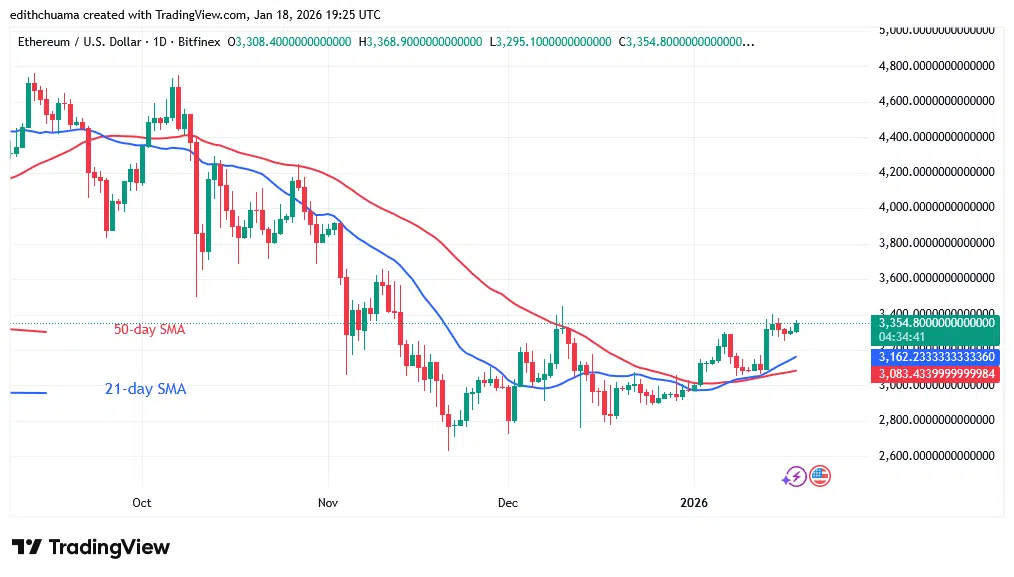 The price of Ethereum moves sideways below the $3,400 threshold, indicating a positive trend. Since January 2, the cryptocurrency price has been range bound above the moving average lines but below the $3,400 barrier level. Since December 9, 2025, purchasers have made three unsuccessful attempts to keep the price above the $3,400 high. The price movement has stuck below the resistance level of $3,400 and continues to oscillate below it. On the upside, if the $3,400 barrier is broken, Ether will soar to $3,655.
