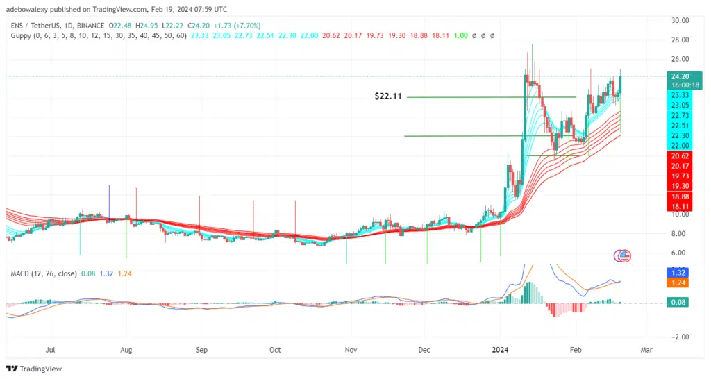 Ethereum Name Service’s price action has witnessed moderately sustained volatility, assisting the token to reach the $18, $20, $22, and $24 price marks. Particularly, the ongoing session has broken through a new resistance at the $24.00 mark. Let’s examine the token’s chances of extending the upside retracement towards higher levels.