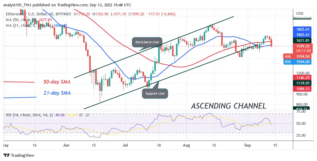 Ethereum’s (ETH) price declines as it holds above $1,568. The biggest altcoin has turned down from the $1,800 resistance zone. The downtrend will be accelerated if price breaks below the moving average lines. The bearish momentum will extend to the low of $1,424. Nonetheless, if Ether falls below the 50-day line SMA, the selling pressure will subside as the crypto resumes a sideways move. Ether will be trading above the 21-day line SMA but below the 50-day line SMA. The coin will be in a range-bound move for a few more days.