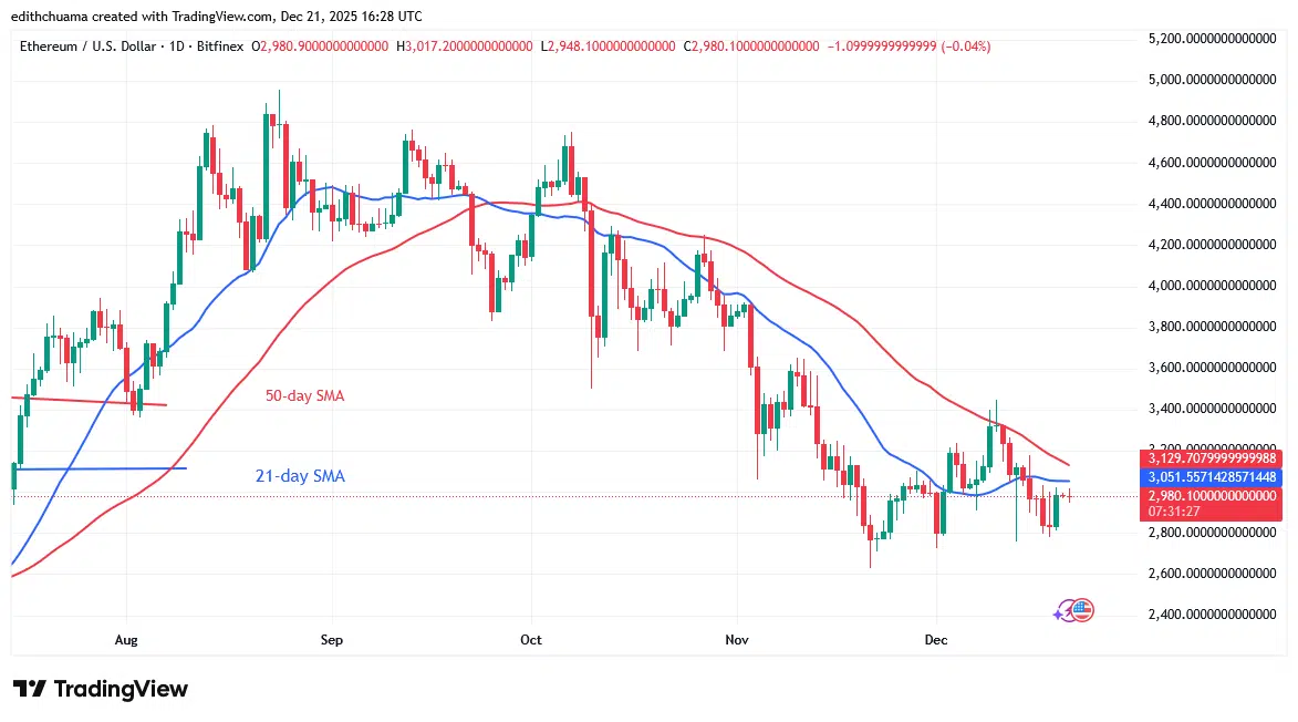 Ethereum’s price falls below the moving average lines and retests its $3,000 high. Since November 21, the selling price has stalled above the $2,800 support. The largest altcoin has remained in a range-bound move above the $2,800 support and below the moving average lines. On December 19, the upward corrective came to a halt at the 21-day SMA barrier, prompting a pullback.
