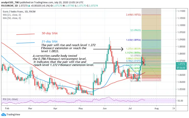 The pair in an upward move but was resisted at level 1.0800. The market retraces to level 1.0720 and resume a fresh uptrend. A correction candle body tested the 0.786 Fibonacci retracement level. It indicates that the pair will rise and reach level 1.272 Fibonacci extension level. EUR/CHF will rise and reach level 1.0833.